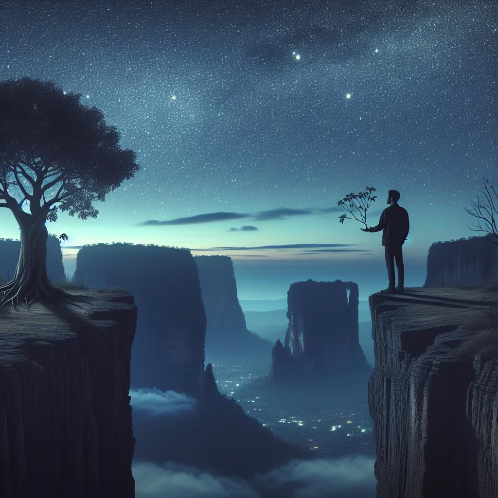 夜空繁星下,一位穷困潦倒、心如死灰的男子,站在悬崖之边,放声痛哭,怨天尤人。他的孤独与绝望,唤起了崖边岩石上一棵树的共鸣。这棵树生活在岩石的缝隙之中,受尽风霜雨雪的折磨,生活极其艰辛。